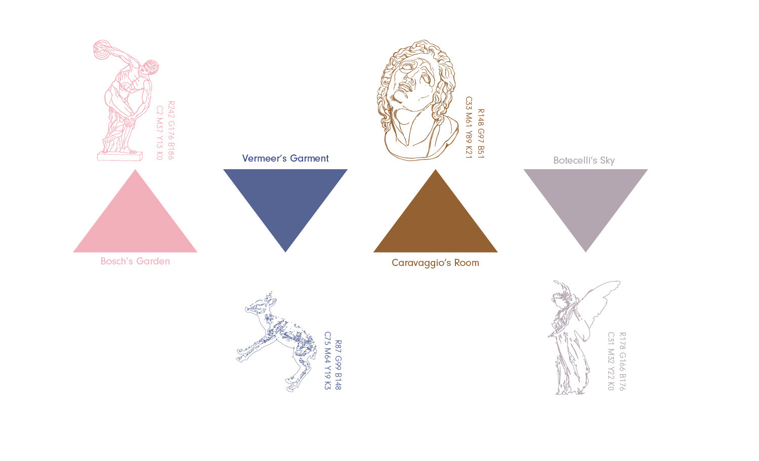 The primary palette represents the grand space and golden time. The secondary palette adds a brush of youth and lightness to complement.